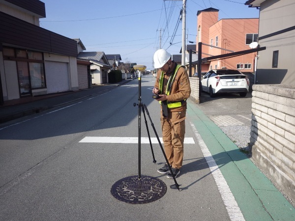 上水、下水道マンホールなどの位置を把握するために行う広範囲に及ぶ調査などの場合、従来であれば、その広範囲を補う基準点測量を行う必要がありましたが、単点観測法を用いることにより基準点を設置することなく座標の取得が可能になります。
