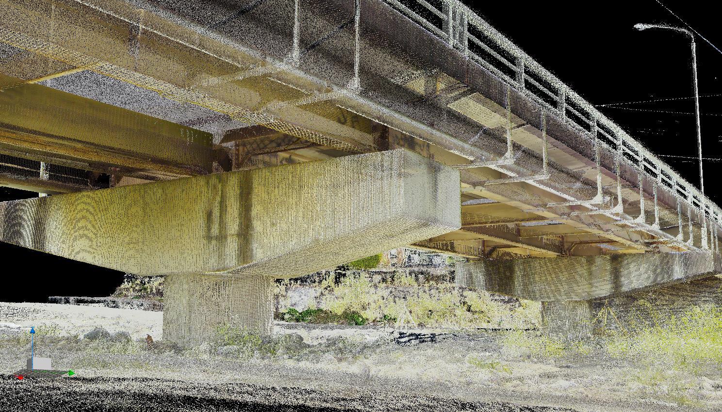 地上型レーザースキャナーは、広範囲を短時間でかつ高精度で行う、3次元計測技術です。取得された3次元データには、同時に取得される画像データにより色情報及び反射強度の情報も付与されます。この取得された3次元データを用いることにより、地形図や縦横断図の作成、構造物の形状や欠損箇所の把握、文化遺産計測や3次元モデリング等、様々な業務に活用することができます。また、UAV写真測量では補完しきれない樹木の影や橋梁下などを地上型レーザースキャナーと併用し、データの合成を行うことで、360°可視化を可能とし、一層の効率化が実現、より精度の高いデータの提供が可能になります。