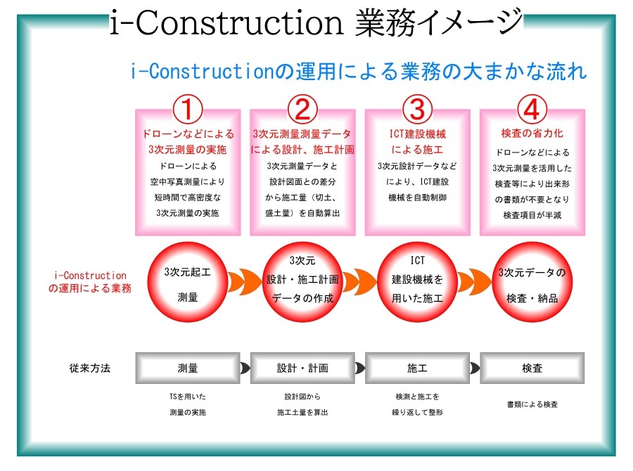 また、ICT技術の全面的な活用を建設現場に導入することにより、合理化を推進し、経営環境や労働環境の改善をしようとする狙いもあります。
