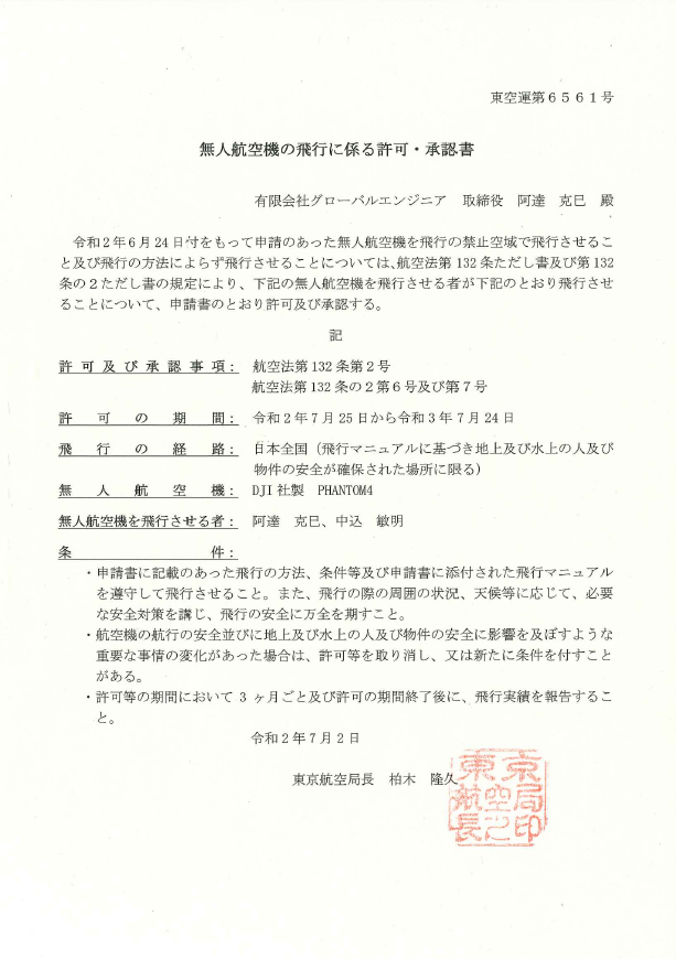 無人航空機の飛行に係る許可・承認書